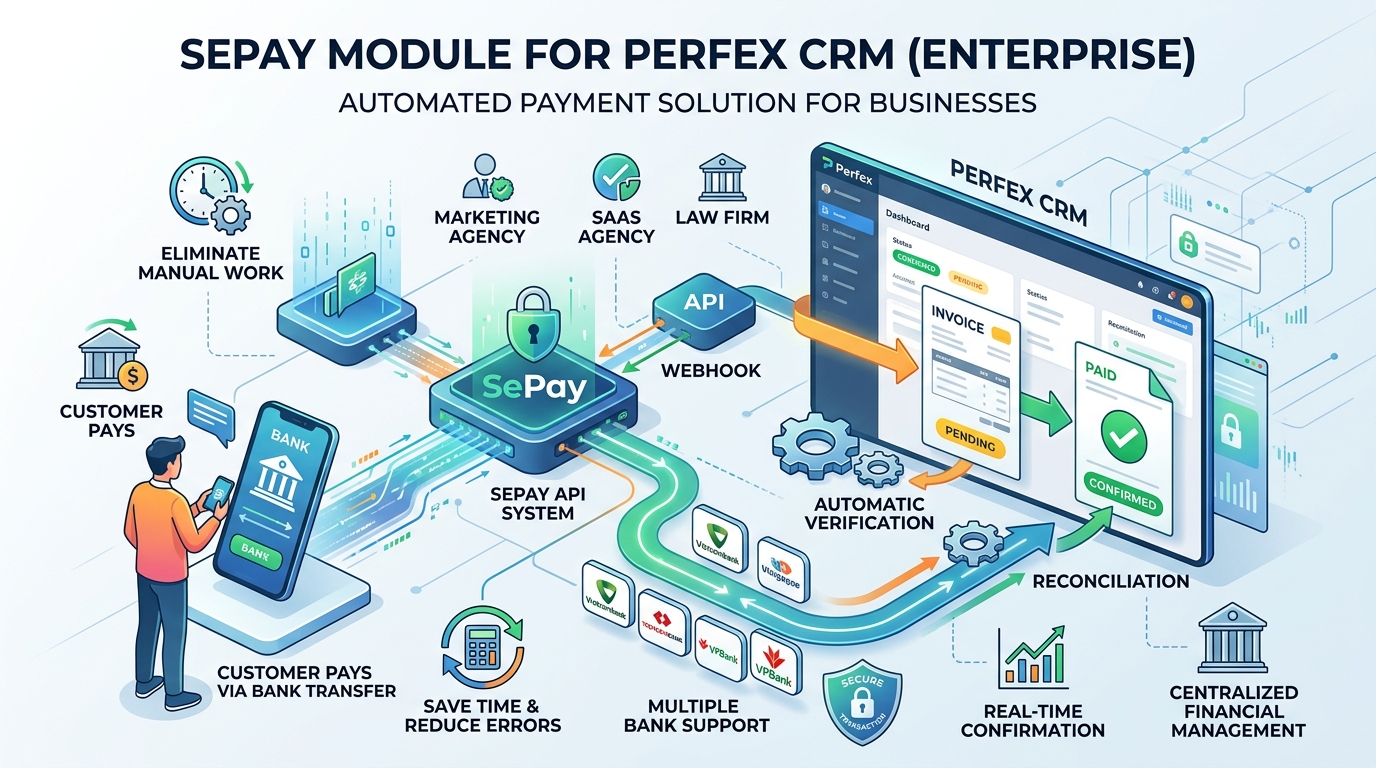 Module SePay cho Perfex CRM là giải pháp giúp doanh nghiệp tự động xác nhận thanh toán chuyển khoản ngân hàng thông qua hệ thống API của SePay.